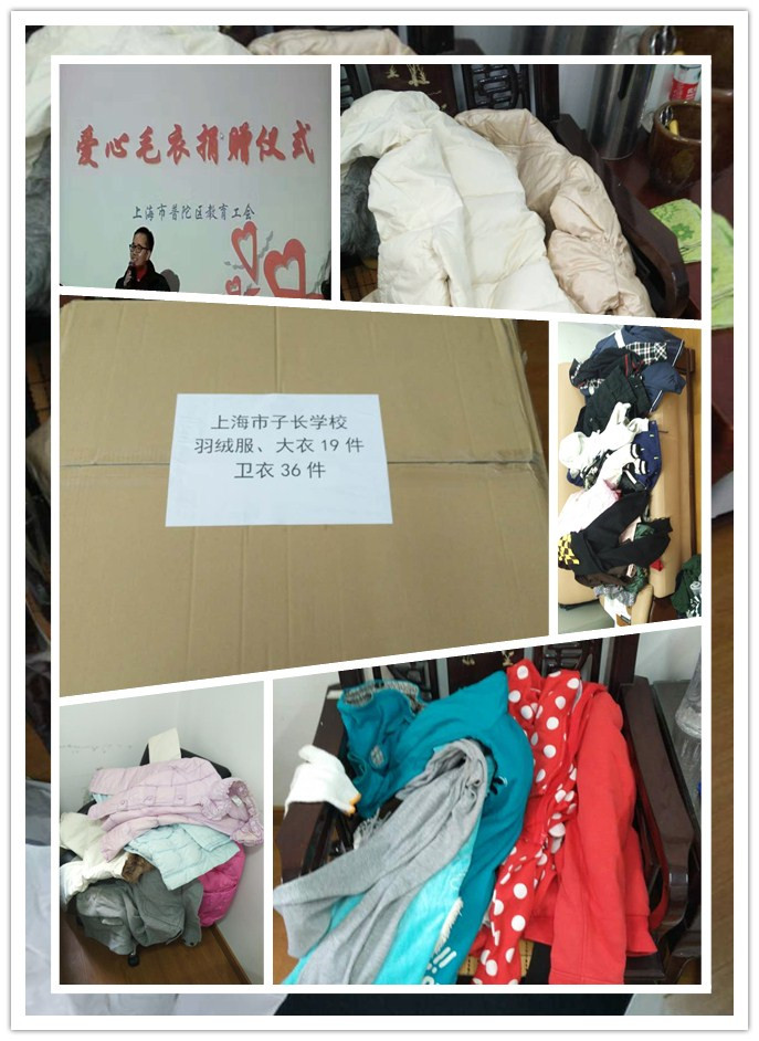 2017年学雷日前夕,“爱心传递 温暖亚东”爱心毛衣捐赠仪式在铜川中学举行。仪式上,西藏亚东中学梁校长介绍了亚东中学的情况:亚东中学海拔在4000米以上,冬日日照只有4个小时;学生都是牧民子女,贫困生较多,吃住都在学校,中途不回家,无更换衣服,卫生条件极差。他希望广大教师积极捐赠御寒衣物,将上海教师的温暖送到亚东孩子的身边。子长学校教师得到这个消息后,积极行动起来,短短的两天之中,共收到羽绒服、大衣共19件,毛线衣、卫衣共36件。相信这些衣服一定能捎去子长学校老师的爱心,带给亚东中学的学生温暖。在此,感谢孟清清和刘兆春老师帮忙清点、打包;感谢下列老师的爱心捐赠: